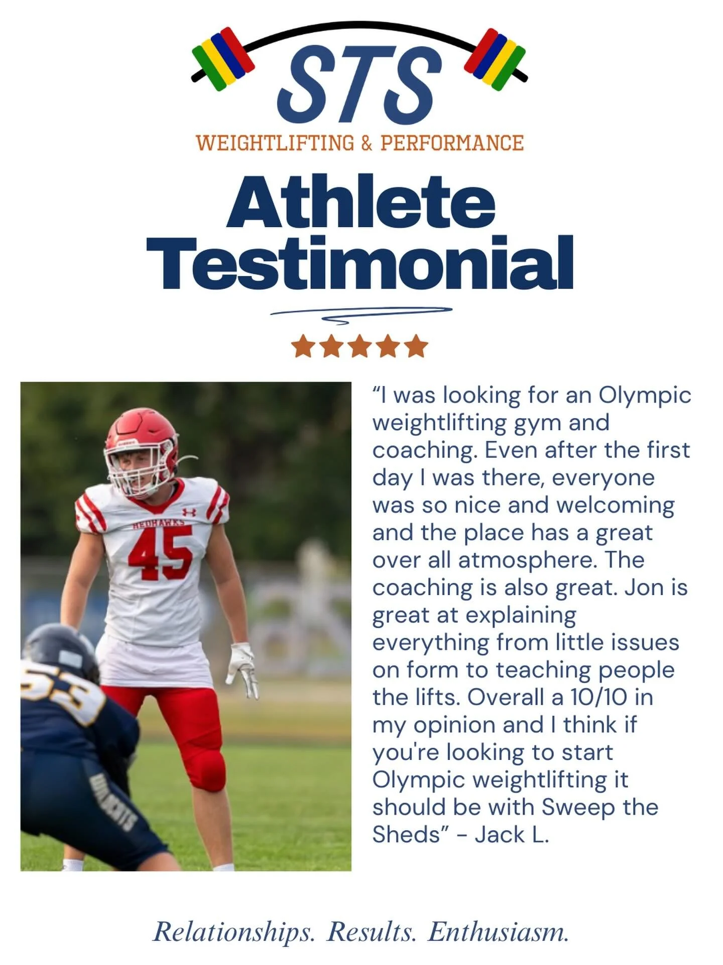 “Coach Sax provides exceptional quality of instruction and is deeply passionate about weightlifting. He places intense focus on teaching the correct technique and ensuring that every lift is performed with precision. Coach takes the time to break down each movement, teaching the basic mechanics before progressing to more advanced lifts. This methodical approach is invaluable for both beginners and experienced athletes looking excel in their respective sports. Coach Sax provides unparalleled weightlifting experience characterized by a strong focus on instilling championship level culture. If you want to be a phenomenal athlete and develop your character then STS is the sports performance program for you.”